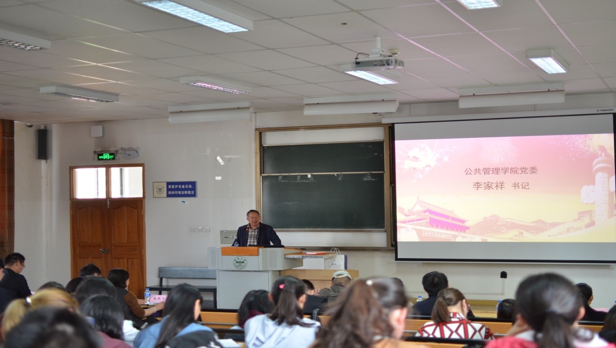 公共管理公司党委李家祥书记在会上以“奋斗新时代,实现新作为”为主题为政治系全体师生讲授了一堂生动精彩的党课。李书记指出,党的十八大以来,以习近平同志为核心的党中央励精图治、攻坚克难,以巨大的政治勇气和强烈的历史担当,统筹推进“五位一体”总体布局、协调推进“四个全面”战略布局,推动党和国家事业取得了历史性成就、发生了历史性变革,引领中国特色社会主义进入新时代。目前,公司双一流建设正处于关键建设阶段,政治系全体师生要自觉投身于双一流建设,“进行伟大斗争、建设伟大工程、推进伟大事业,实现伟大梦想”。