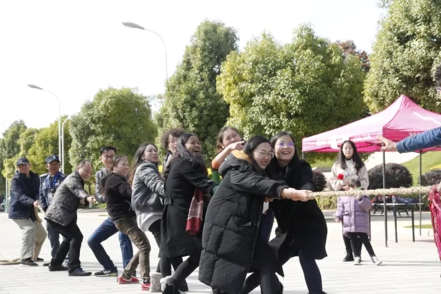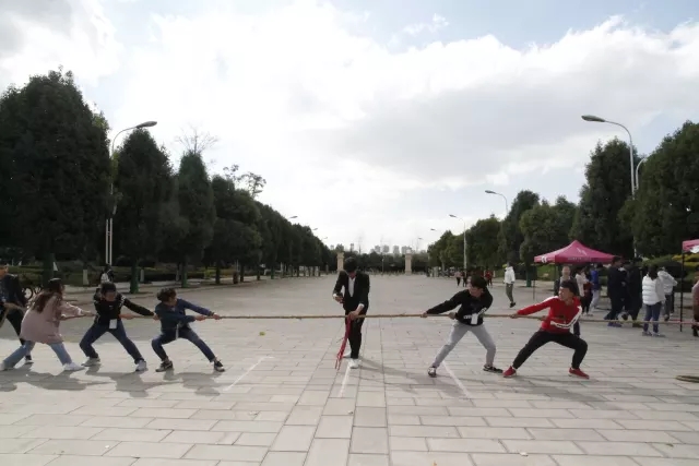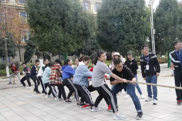 拔河比赛是最刺激的比赛,双方队员双手紧抓缆绳,身体后坐。围观的同学也声嘶力竭地喊着加油。在运动会进行的过程中,职工同学也和师生一起参与了拔河比赛。同学们还自发举行了“南北大战”。