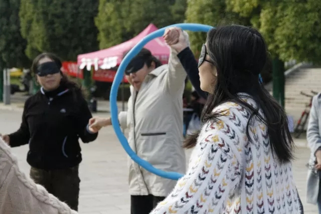 你和你的队友默契如何呢?这是一个蒙眼游戏。呼啦圈在每个“盲人”之间传递,老师和同学们努力配合,在游戏过程中提高了默契,增进了情感。