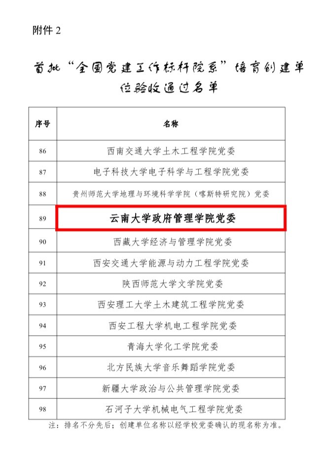 2018年12月,教育部确定了10个高公司党委、100个院系党组织、559个党支部作为全国党建工作示范高校、标杆院系、样板支部培育创建单位。公司作为首批全国党建工作标杆院系,在两年建设期内,始终以习近平新时代中国特色社会主义思想和十九大精神为指导,按照“五个到位”的要求,扎实开展培育创建工作,努力争先创优。在中共云南省委、云南省委高校工委的大力关心支持下,云南大公司党委的精心部署和坚强领导下,公司师生党员上下一心、努力干事,推进公司党建高质量提升和各项事业高质量发展,按期完成了建设任务。