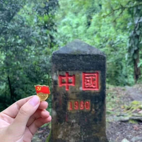 作品说明:图片所摄界碑为独龙江中缅边境第41号界碑。看到党徽在扶贫一线熠熠生辉,我们要传承党徽光芒,让党的光辉照耀在祖国的每一寸土地。