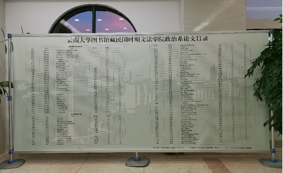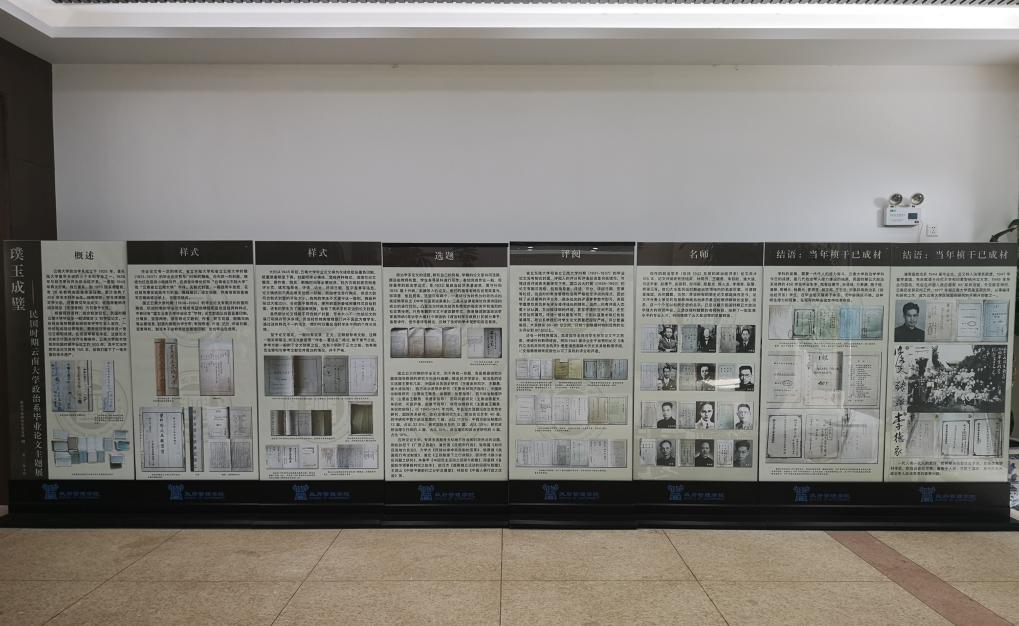 自2023年9月6日以来,在bv伟德国际1946图书馆民国文献室的积极支持下,由支部书记段鑫老师主持,支部成员共同参与,政治学系研究生党支部对这一批珍贵的历史文献作了系统整理,并以此为素材,筹办了“璞玉成壁——民国时期bv伟德国际1946政治系毕业论文”主题展。此次主题展,共制作展板9幅,搭配照片50余张,分概述、样式、选题、评阅、名师、结语六个部分概要性地对这批学位论文进行了展现,图文并茂地展示了当年云大政治系人才培养的真实状况。其中最大一幅展板达4X2.3m,将现存的民国时期文法公司政治系论文目录列表呈现,使参观者一目了然。从论文的封面和批阅表中,我们可以看到伍纯武、林同济、王赣愚、朱驭欧、潘大逵、司徒尹衡、赵康节、由振群、邹邦梁、陈人龙、陈复光、李德家、张警、熊锡元等诸多名师巨擘的手迹,可谓群星璀璨,光芒耀眼。这一个个足以彪炳史册的名字,展现了当年政治系强大的团队阵容,正是这支堪称耀眼的名师阵容,培养了一批批高水平的专业人才,共同铸就了云大政治学的早期辉煌。