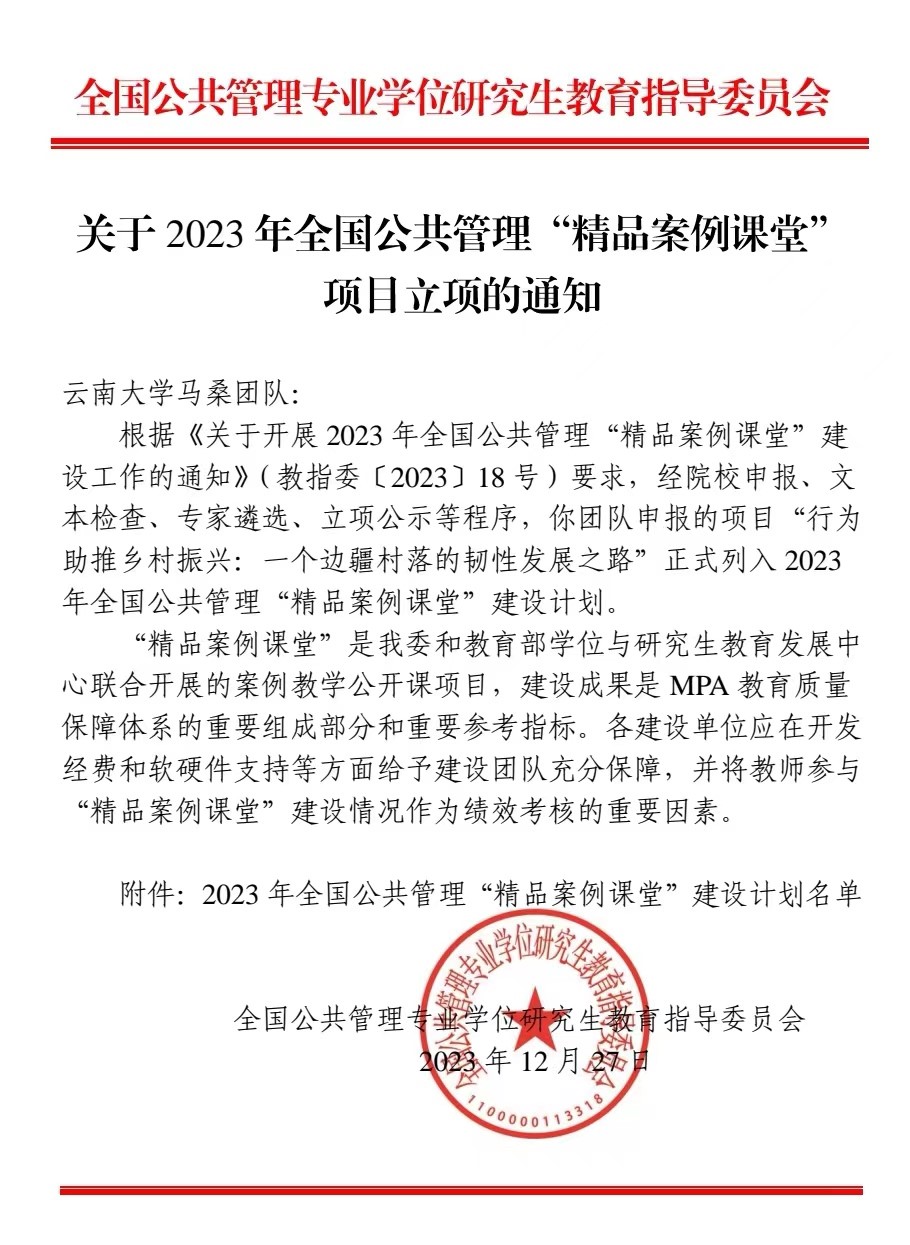 在12月27日公布的2023年全国公共管理“精品案例课堂”建设计划名单中,伟德国际VICTOR1946公共管理案例团队喜获立项,标志着公司首次获批此项国家级精品课程项目。该项目由马桑教授领衔,邓崧、罗红霞、陈然三位教师共同参与。全国公共管理“精品案例课堂”项目由教育部学位与研究生教育发展中心和全国公共管理专业学位研究生教育指导委员会联合开展,旨在强化案例教学,推动教学方法创新和理念传播,探索公共管理专业学位案例教学范式,服务实践创新人才培养,是公共管理教育质量保障体系的重要建设项目。经过严格的文本检查和专家遴选,全国共有59项申报项目列入2023年建设计划。