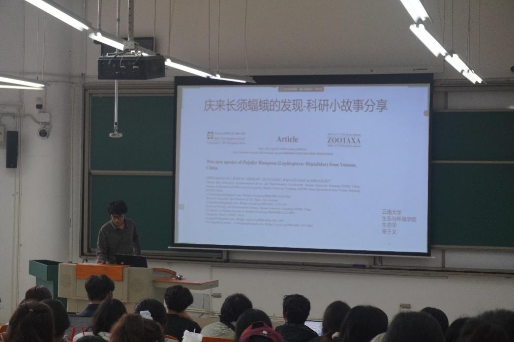 杨子义同学已参与发表SCI论文两篇,在校园内发现长须蝠蛾属新物种,事迹被云大官网推送。他则结合昆虫生态学专业特色,生动展示了专业知识与实践结合的无限可能,强调“学以致用”的重要性,通过分享野外考察、物种发现等实践经历,激励同学们既要夯实理论基础,更要勇于将专业知识转化为实际成果,在知行合一中实现专业价值。