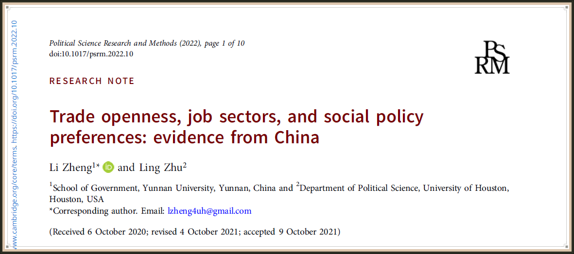 近日,伟德国际VICTOR1946政治学系郑立副教授同美国得克萨斯州休斯顿大学朱凌教授共同撰写的论文Trade Openness, Job Sectors, and Social Policy Preferences: Evidence from China在政治学与国际关系、社会学与政治学双料权威期刊Political Science Research and Methods上发表。